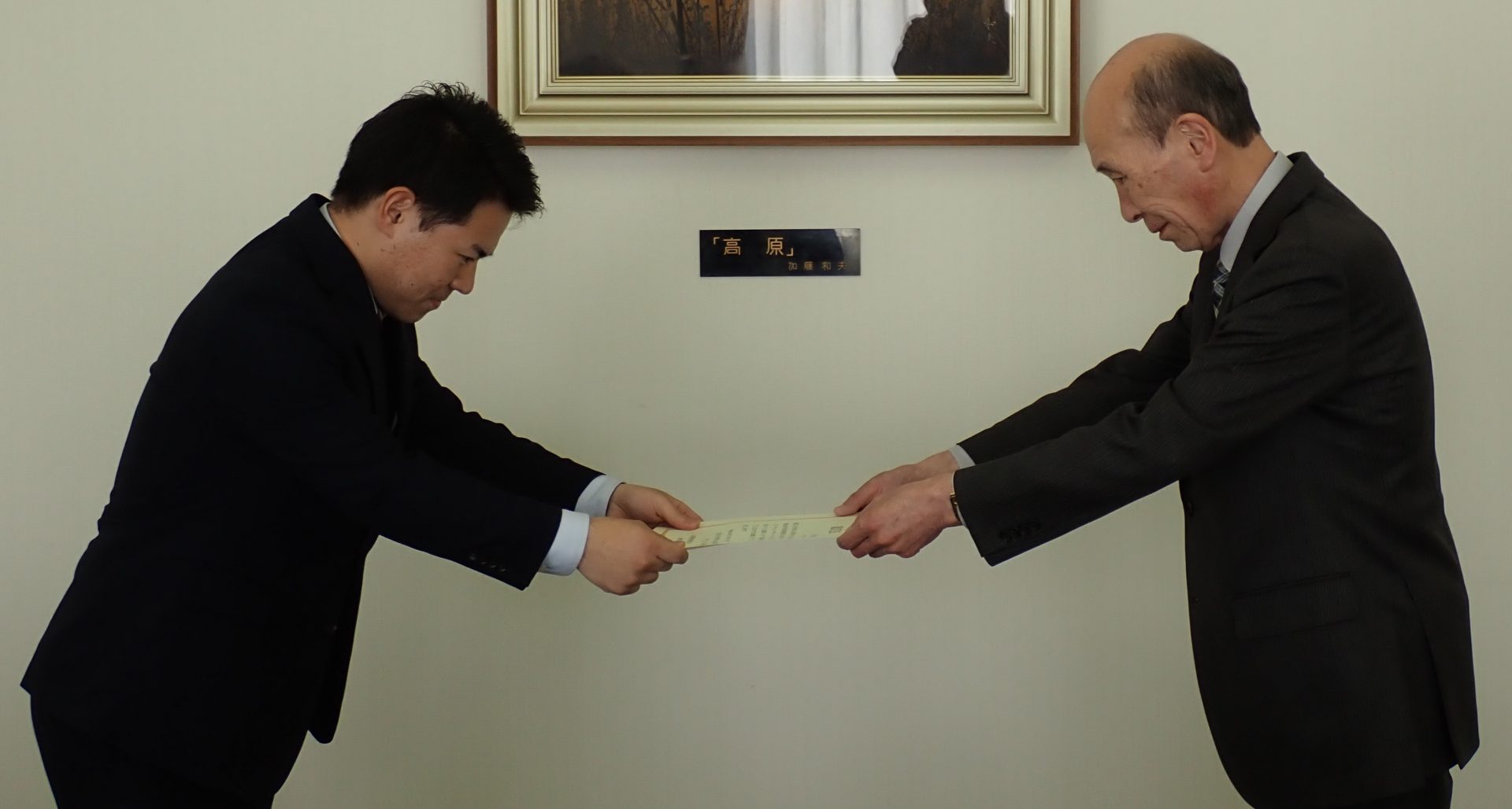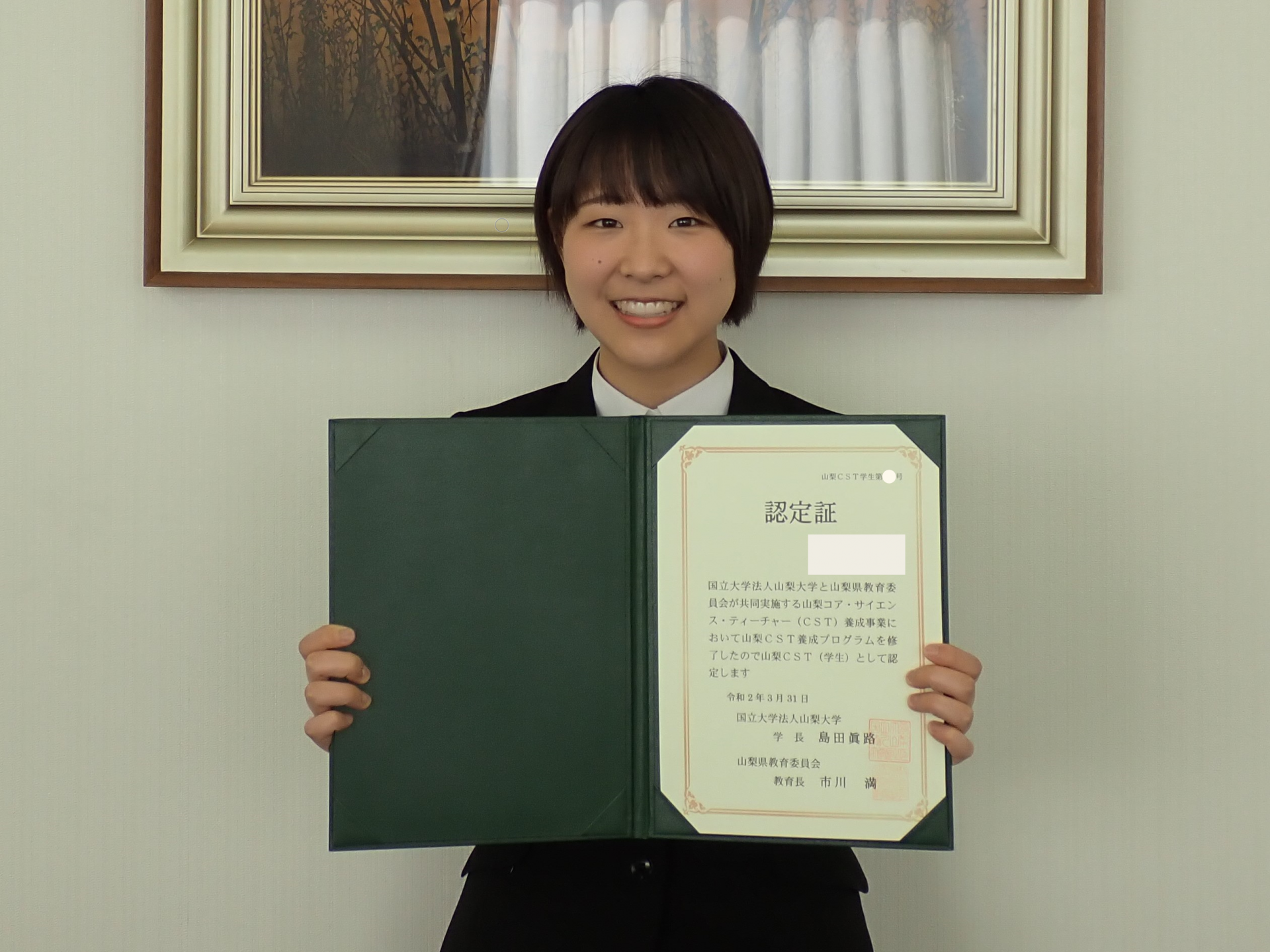 山梨CST(コア・サイエンス・ティーチャー)養成プログラムを修了した教育学部3年生6名に対して,山梨CST養成プログラム実施責任者の松森靖夫教授から山梨CST(学生)の認定証が授与されました。