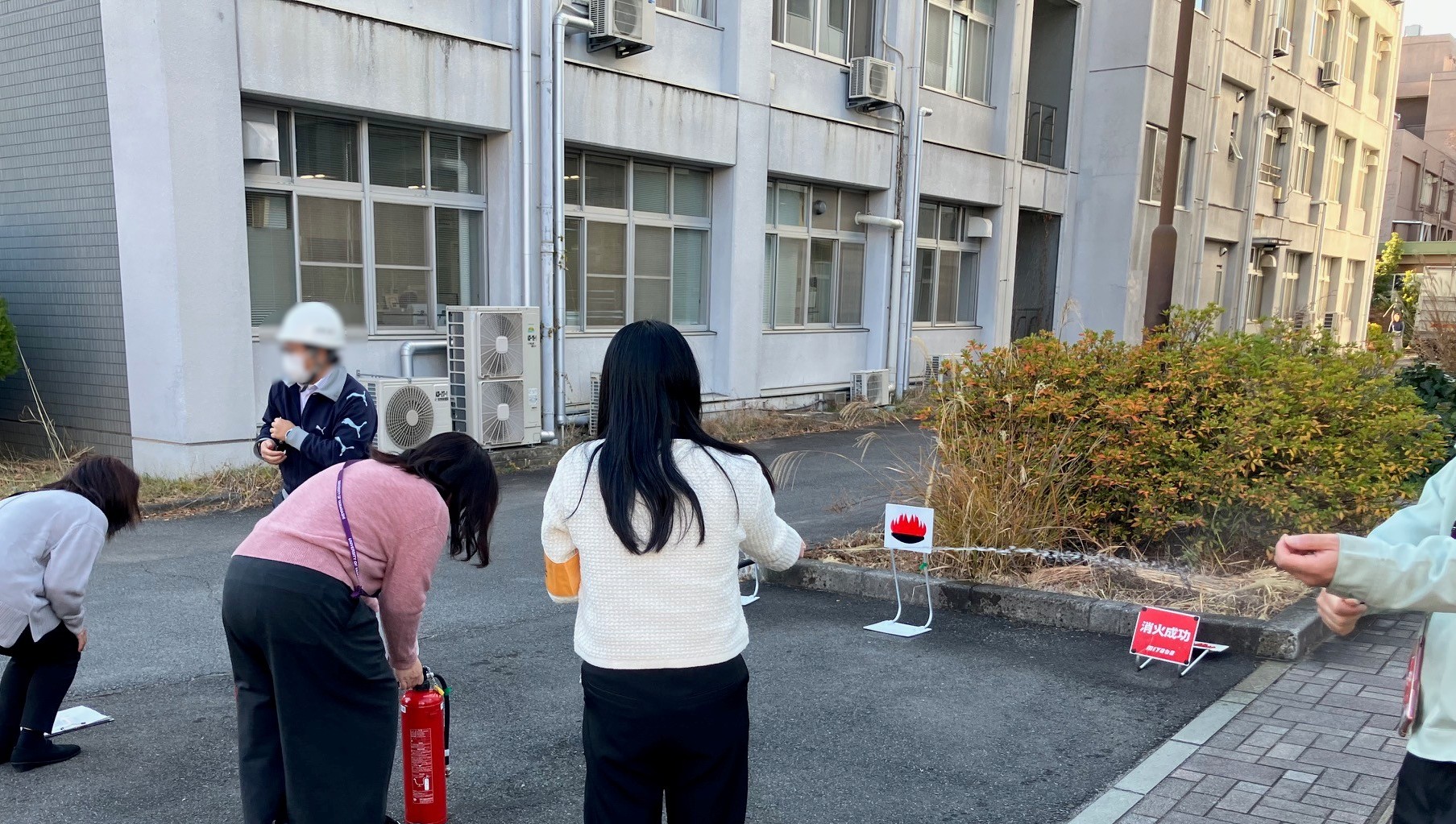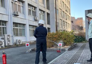 今回の防災訓練では教育学域M号館から出火した想定で、初期消火や通報・避難誘導の流れを確認しました。その後の消火訓練では、訓練用の消火器を用いて初期消火を行う訓練を行いました。
