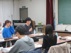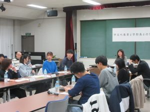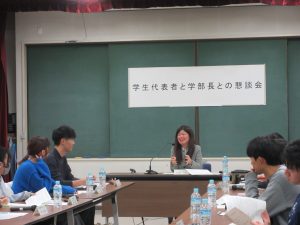 教育学部の各コースを代表する学生7名が参加し、日頃の大学生活で感じている率直な意見や要望を発表しました。教員側からは、長谷川学部長をはじめとする7名が出席し、学生一人ひとりの声に丁寧に耳を傾けながら回答しました。大学生活の充実に向けた改善案や、授業・教育実習に関する要望など、幅広い意見が寄せられ、終始活発な意見交換が行われました。