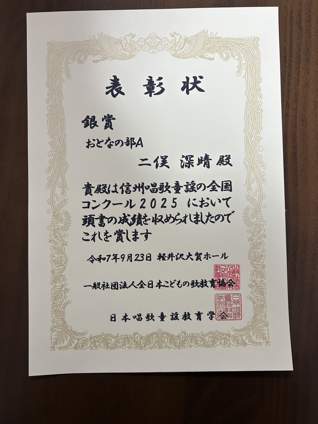 教育学部芸術身体教育コース音楽教育系4年二俣深晴さんが、2025年9月23日に軽井沢大賀ホールで開催された信州唱歌童謡の全国コンクール2025全国大会にて大人の部A銀賞を受賞しました。信州唱歌童謡の全国コンクールは、こどもたちが心から歌う喜びを実感し、参加者の更なる音楽への探究心、研鑽意欲を向上させることを目的として毎年開催されている全国コンクールです。