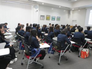 参加者は、メモを取りながら説明を聞き、「どのように少人数教育を行っているのか」「クリティカルシンキングの重要性をどのように捉えているか」といった質問を寄せていました。
